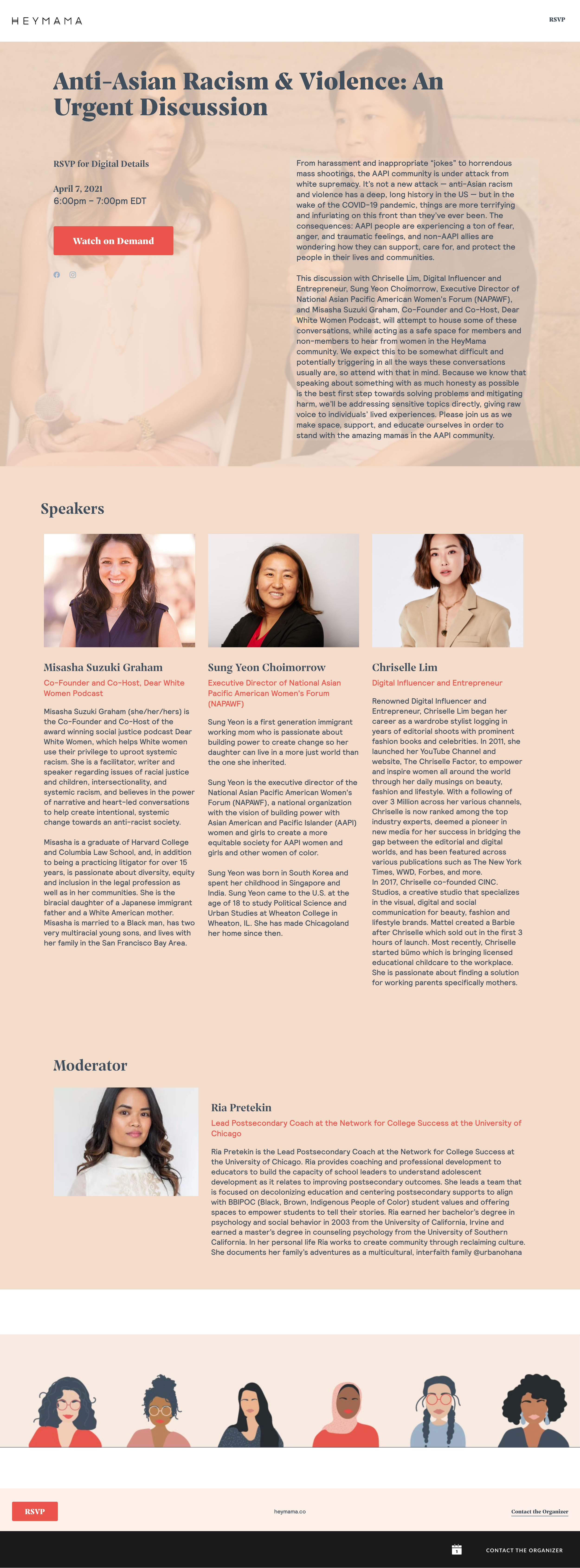 I brought this virtual panel to HeyMama, programmed it with leading AAPI voices within the HeyMama community, and worked with Ria of Urban Ohana to create a run of show and thoughtful questions that would lead to meaningful dialogue for our speakers. This resulted in 50+ attendees who joined us live for the virtual discussion.